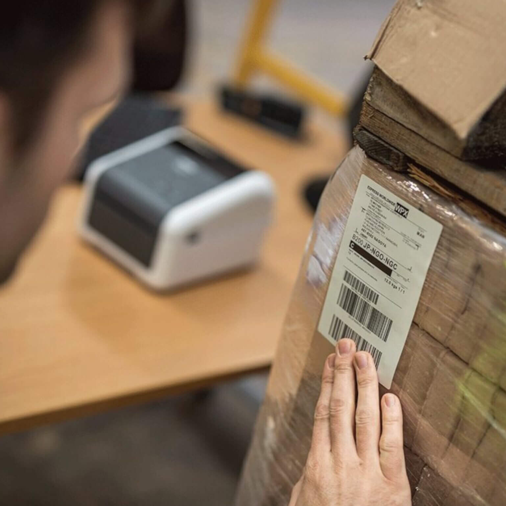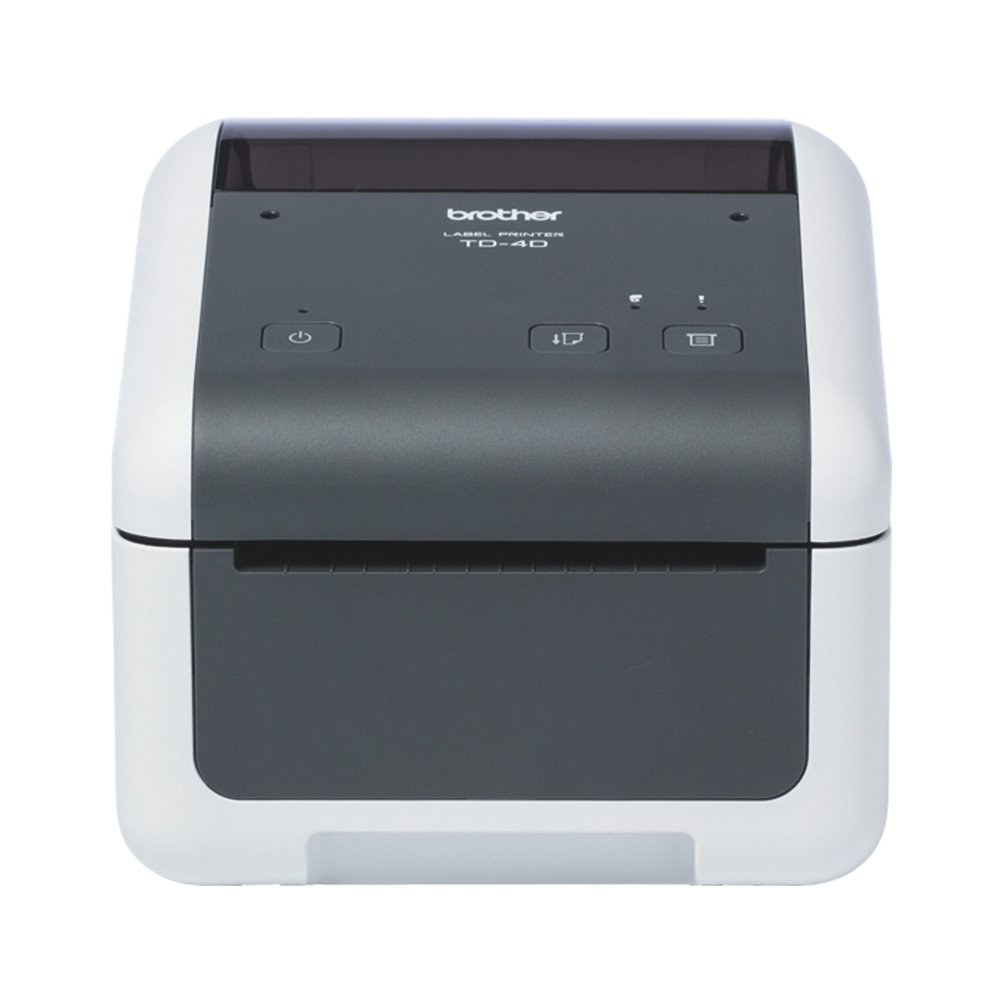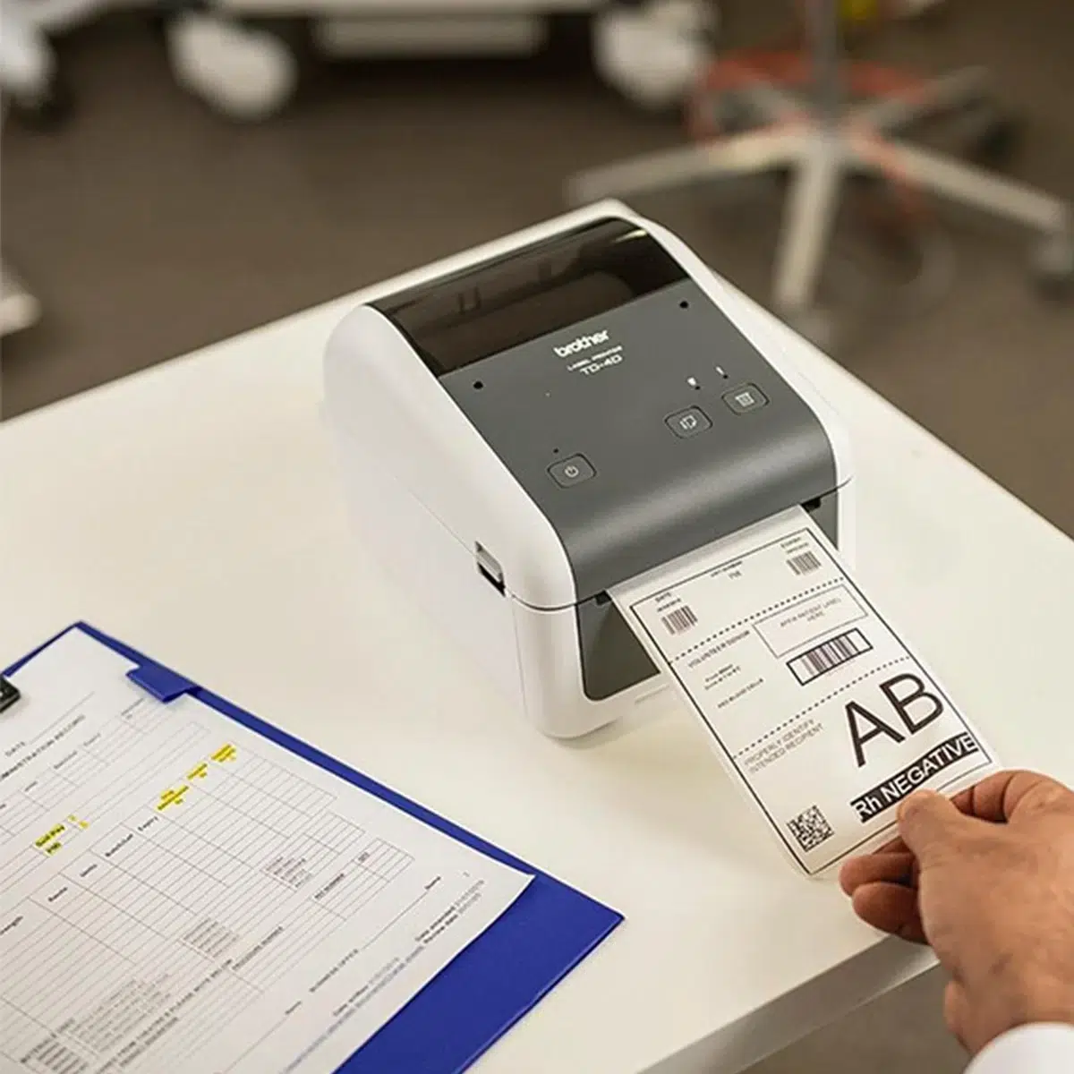Impresora de etiquetas y tickets de sobremesa de tecnología térmica directa con conectividad USB y serie.