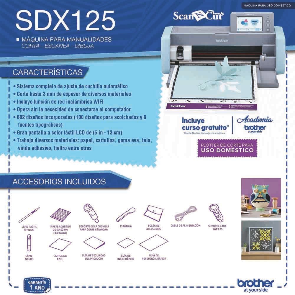 La Scancut SDX125, es un máquina de corte para uso doméstico con escáner incorporado diseñado especialmente para explotar la creatividad en el hogar. Cuenta con 682 diseños incorporados en la máquina y corta diversos materiales de hasta 3 mm de grosor. Cuenta con mayor velocidad y precisión de corte debido a su nuevo sistema de ajuste automático de cuchilla. Ahora, incluye una pantalla táctil LCD de 5 pulgadas, lo cual permite visualizar las imágenes de manera fácil y clara. Su área de escaneo de hasta 30 cm x 30 cm le permitirá realizar proyectos de manera más cómoda y versátil, además el equipo cuenta con conexión inalámbrica WiFi, con lo que podrá transferir tus propios patrones de corte o dibujo al equipo de forma más rápida. La ScanNCut DX corta papel, vinilo, acetato, goma eva, madera balsa, imán, tela y silicona, entre otros. Con el software gratuito de la marca Brother "Canvas Workspace" podrá descargar, editar y crear patrones de corte o dibujo. Crea, diseña y da vida a tus ideas, con el nuevo ScanNCut SDX125.